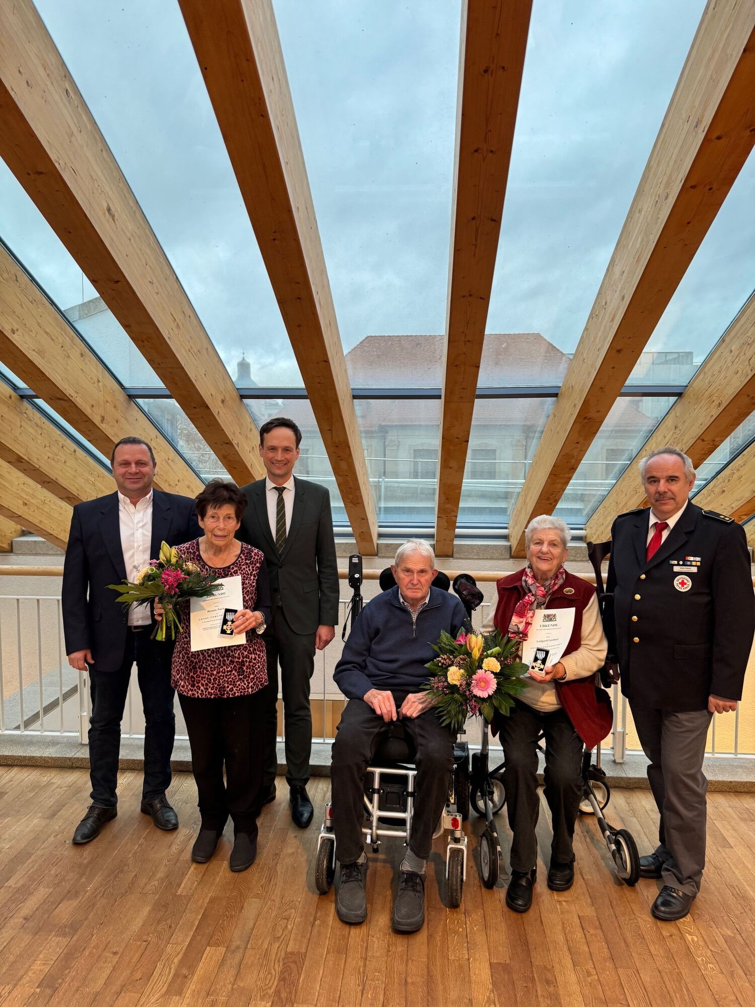 Das Große Ehrenzeichen erhielten Luitgard Lechner aus Werneck-Ettleben und Renate Nacke aus Werneck. Gemeinsam bringen es beide Damen auf über ein Jahrhundert ehrenamtliches Engagement für das BRK. Dabei finden sich immer wieder Parallelen im ehrenamtlichen Werdegang der beiden: Lechner und Nacke fanden den Zugang zu der Hilfsorganisation jeweils über ihre Ehemänner, welche beide bereits dort aktiv waren. Die Geehrten wirkten über all die Jahre bei den Blutspendeterminen innerhalb der Marktgemeinde Werneck im Bereich der Verpflegung mit.