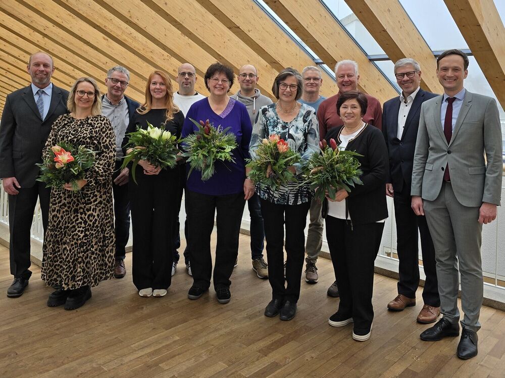 Landrat Florian Töpper: „Sie alle stehen unseren Bürgerinnen und Bürgern im Landkreis Schweinfurt zur Seite – und das in sehr vielfältigen Lebensbereichen. Für Ihren jahrzehntelangen Einsatz und Ihr großes Engagement bedanke ich mich sehr herzlich.“ Personalratsvorsitzender Herbert Memmel schloss sich den Dankesworten des Landrats an.
