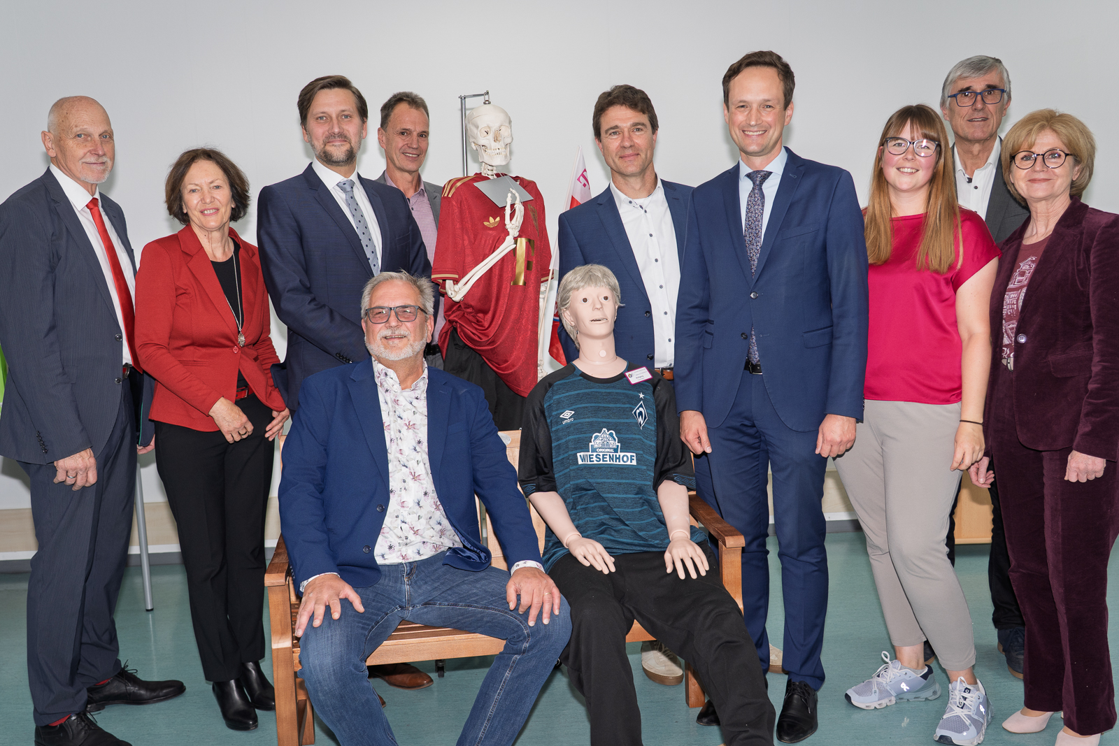Die Veranstaltung endete mit einem kleinen Empfang, bei dem Gäste, Kolleginnen und Kollegen sowie Wegbegleiter die Gelegenheit hatten, persönliche Worte an Wolfgang Schirmer zu richten. Als Abschiedsgeschenke wurden Wolfgang Schirmer (vorne) eine Ruhebank sowie ein Trikot seines Lieblingsfußballvereins von den Kolleginnen und Kollegen überreicht (hierzu wurden eine Übungspuppe und ein Skelettmodell als Überbringer genutzt).
