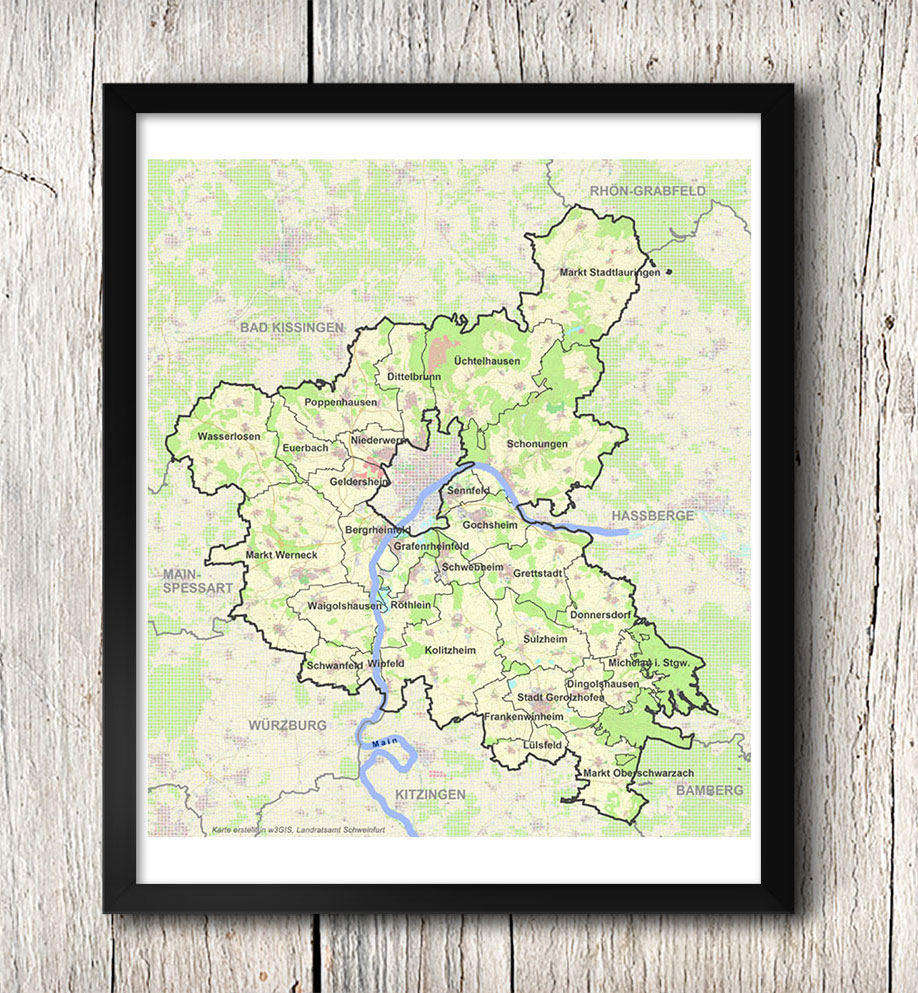 Der Landkreis Schweinfurt hat 29 Gemeinden und umgibt vollständig die kreisfreie Stadt Schweinfurt, die Sitz des Landratsamtes ist.