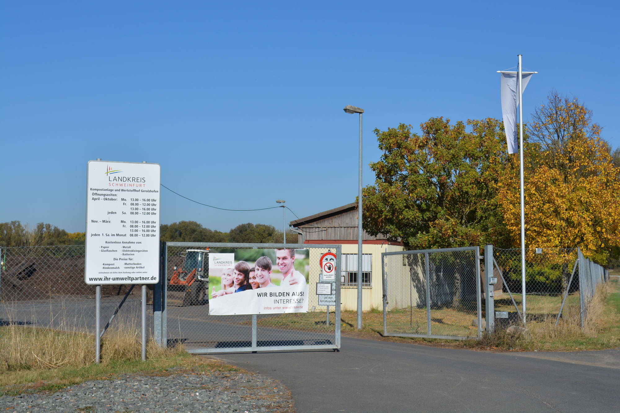 An der Kompostanlage / Wertstoffhof Gerolzhofen gelten jetzt ab November wieder die „Winter-Öffnungszeiten“, das heißt die Anlage ist von November bis März nur an jedem ersten Samstag im Monat von 8 – 12 Uhr geöffnet. Am Samstag, 13. November, bleibt sie – nach der Gartenabfall-Hauptsaison – also erstmals wieder geschlossen. Die anderen Tage sind regulär geöffnet.