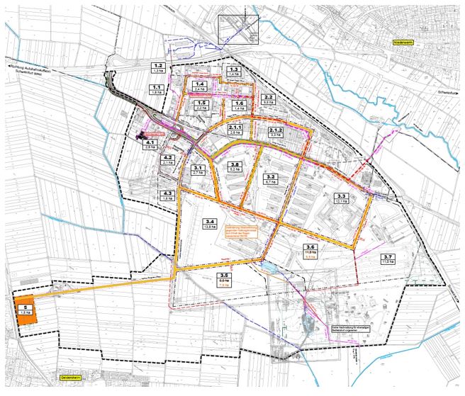 Eine erste Erschließungsplanung (siehe rechts, SRP im Auftrag des Zweckverbandes Conn Barracks) ist als zentrales Element des Nachnutzungskonzeptes Grundlage der noch laufenden Wertermittlung. Die Bereiche 1.1 bis 1.6 im Nordwesten werden bis auf weiteres – auch über das Jahr 2025 hinaus – vom Freistaat Bayern als ANkER-Einrichtung genutzt werden. Diese Bereich kann nicht erworben werden.